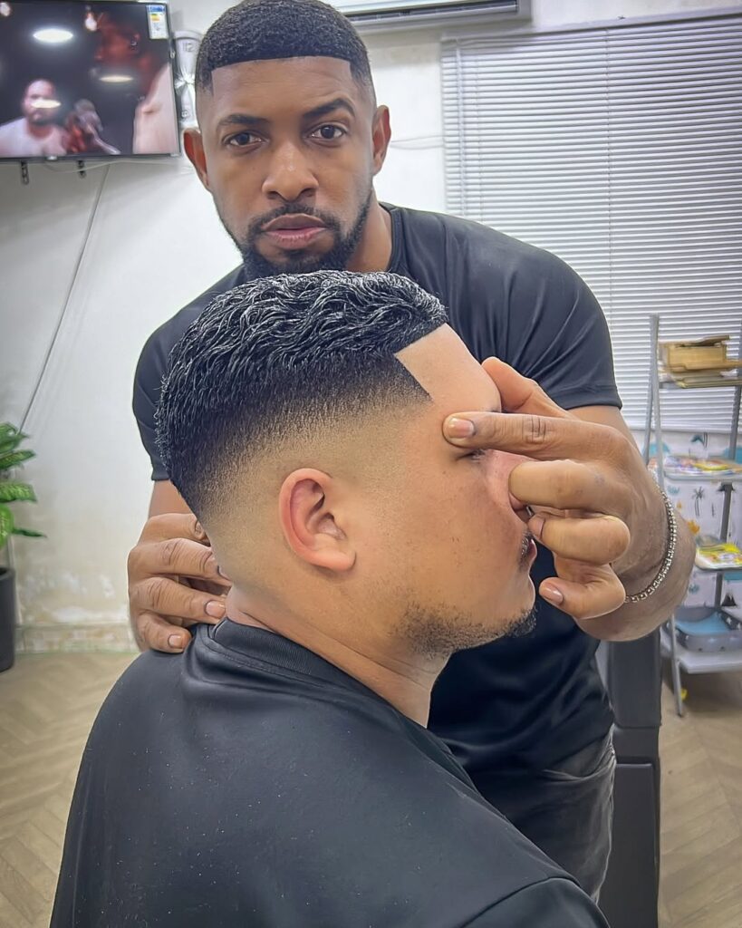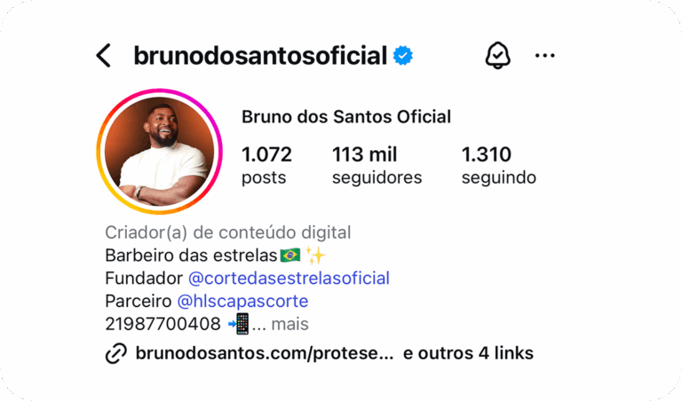 Sou Bruno dos Santos, barbeiro especialista em pigmentação e conhecido como o barbeiro das estrelas. Já atendi influenciadores como Luva de Pedreiro e jogadores de times como Botafogo e Fortaleza, mas nem sempre foi assim. Sonhei em ser jogador, trabalhei em várias áreas, mas foi na barbearia (profissão do meu pai) que encontrei meu propósito.